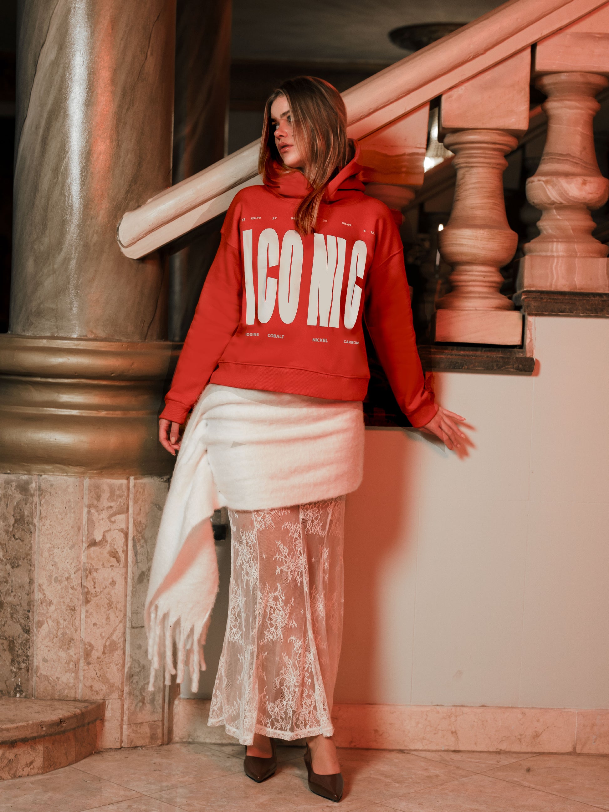 The Iconic Red Hoodie is a bold streetwear piece that blends comfort with statement design. Featuring an oversized white “ICONIC” print on vibrant red cotton, it delivers effortless style with a confident edge. Perfect for everyday wear or layering with lace and textures for a modern, fashion-forward look.