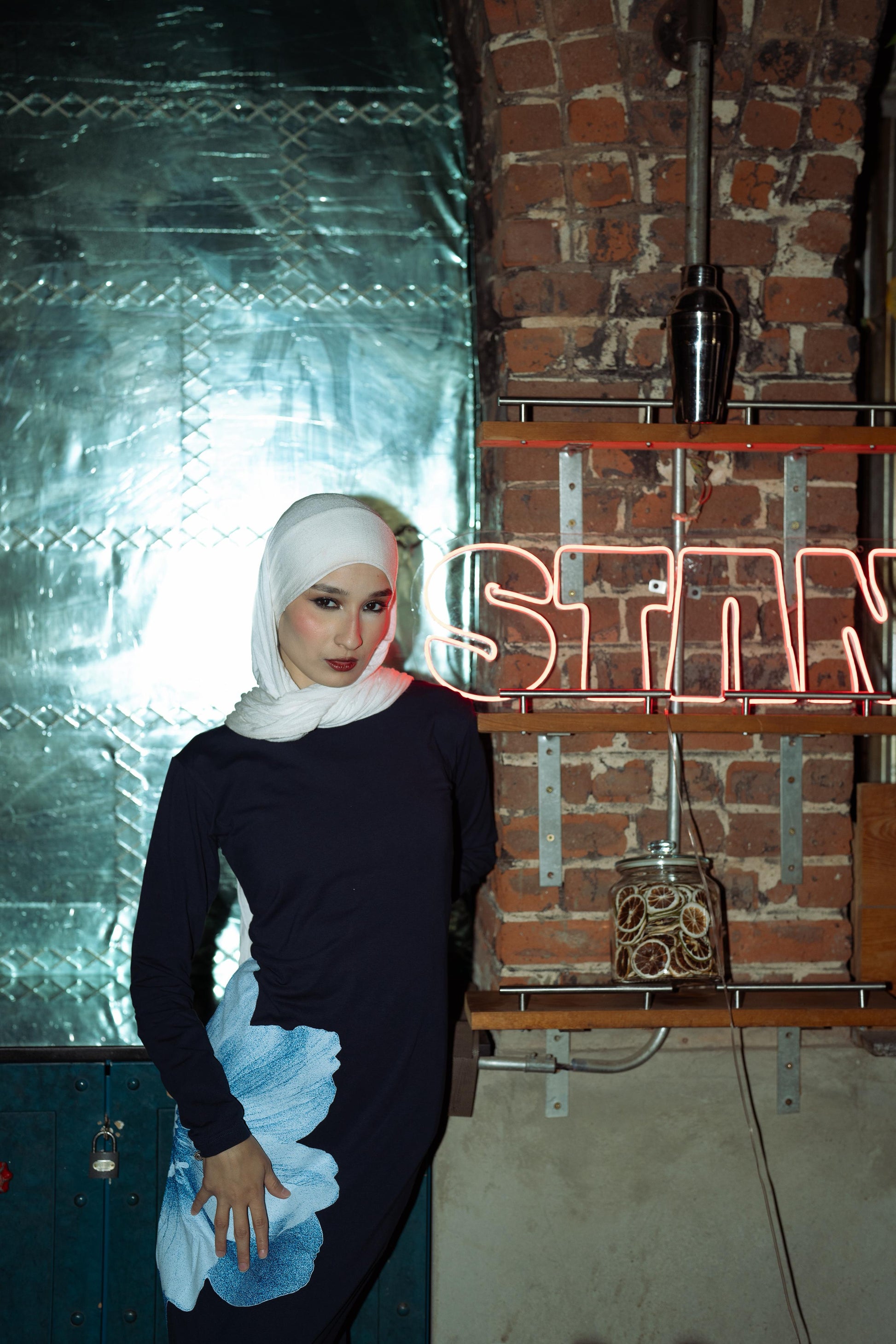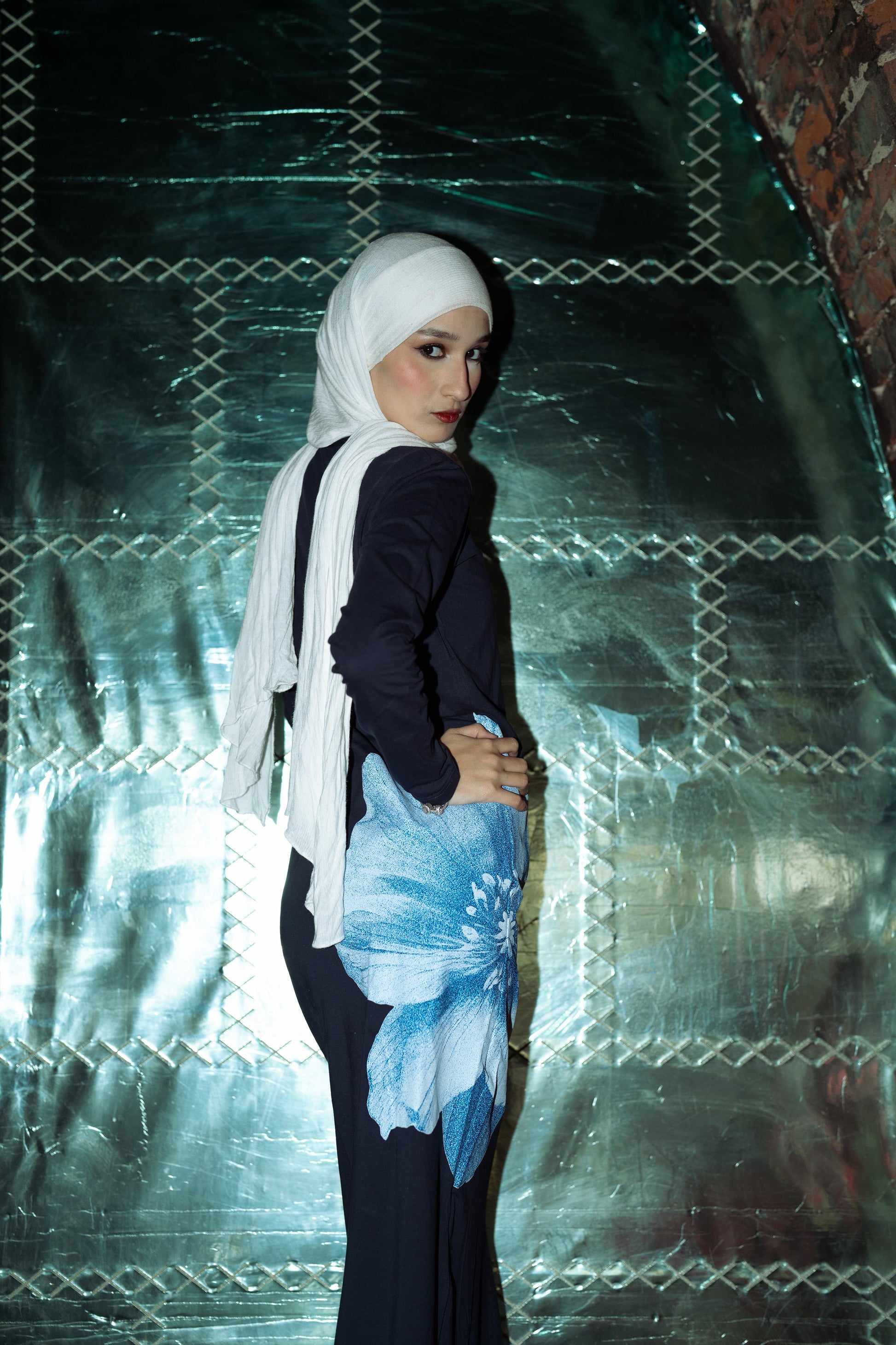 The long sleeve navy tropical dress is suitable for casual and fancy occasions and be dressed up or down, suitable for modest/hijabis . made out of 100% egyptian cotton.