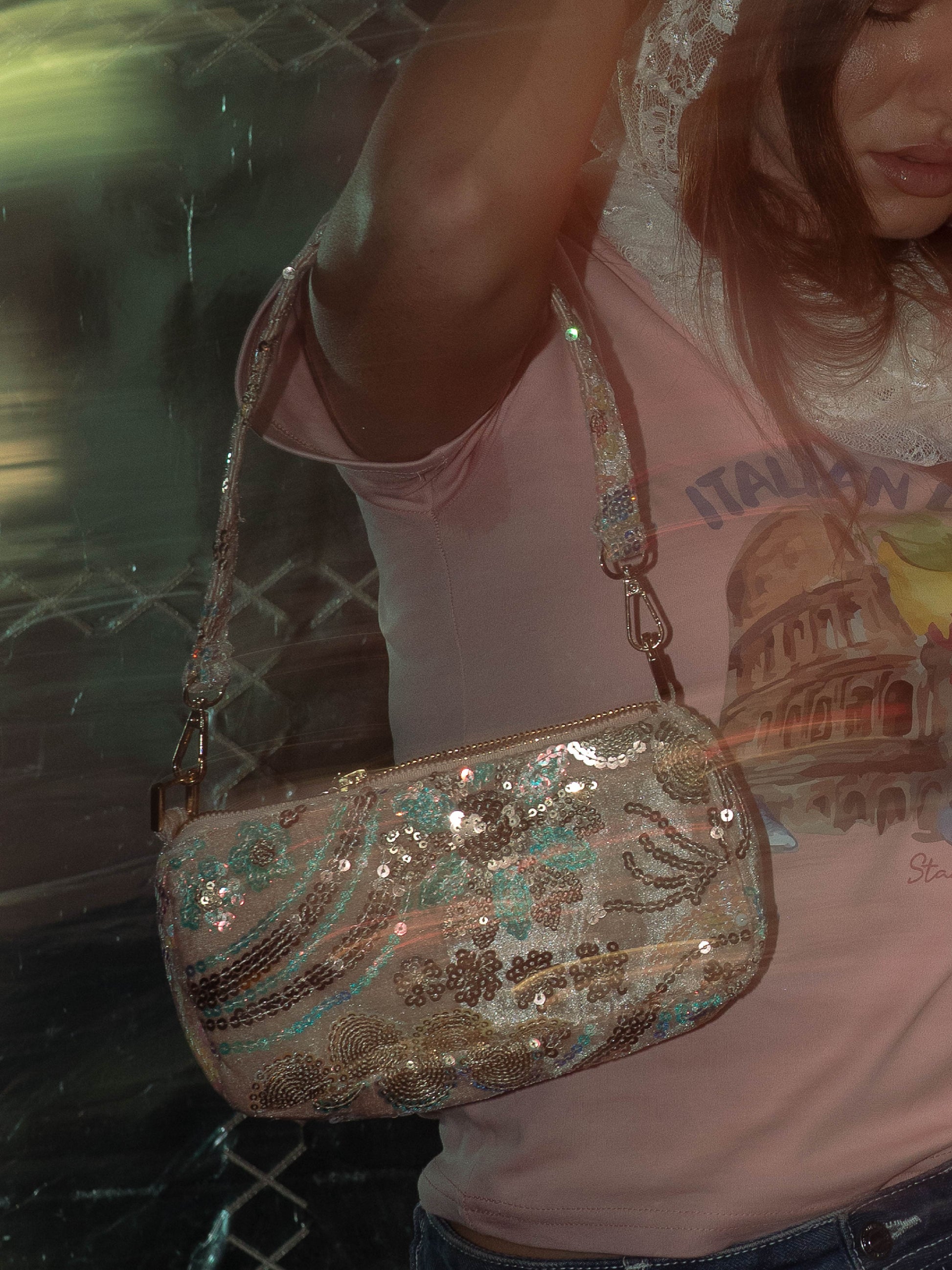A sparkly rose back with beautiful floral patterns gold hardware that could be also used as a clutch